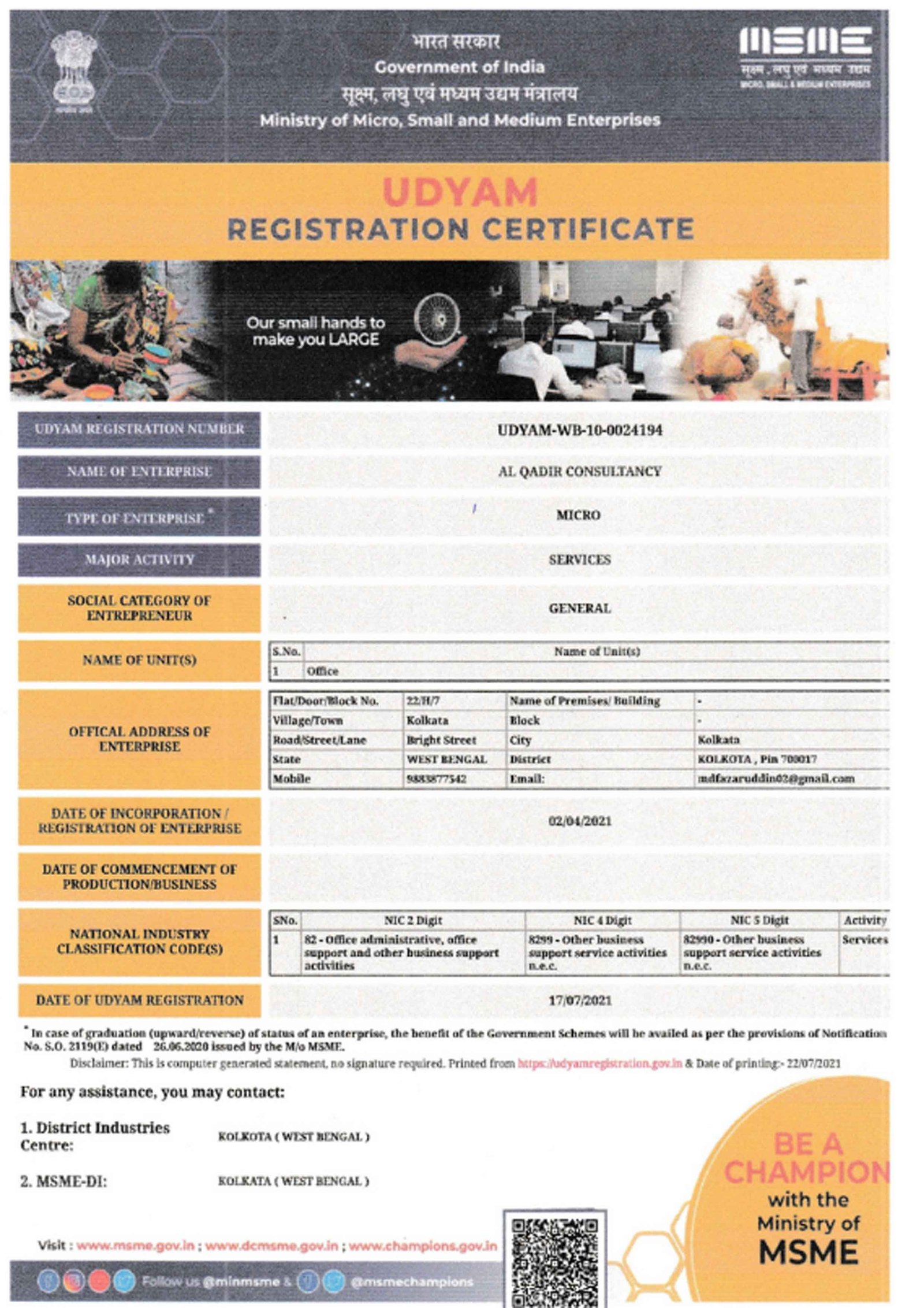 Registration No. UDYAM-WB-10-0024194 and Development of Foreign Employment, Goverment License No. UDYAM-WB-10- 0024194.